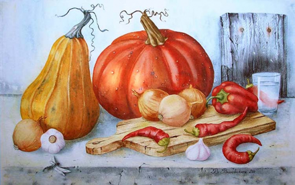 Потерянно и уныло топчется по серым холодным лужам монотонный осенний дождь, вздуваясь на поверхности грязных зеркал мутными пузырями. Отчаянно цепляясь за ветки, обессилено покачиваются последние бурые листья, отяжелевшие от переизбытка влаги. Но и эти одиночки скоро опадут на тёмную, дремлющую до весны землю. Всему предписан свой срок — не за горами уже и зима с трескучими морозами да метелями. Но пока сыро и зябко за окном. Но внутри натопленного дома тепло и уютно. А чтоб и вовсе было хорошо, неплохо бы приготовить что-нибудь вкусненькое… а хоть бы и из тыквы — её-то уродилось в этом году прорва! Можно, конечно, сладкую и сочную тыквенную запеканку с творогом или, допустим, запечь ломтиками с сыром, но сегодня почему-то хочется просто затушить тыковку с овощами, тем более, что это ведь совсем не сложно. Всего-то и нужно, что очистить тыкву, нарезать ломтиками, добавить мелко покрошенный лук и чуть крупнее болгарский перец. Да, неплохо бы ещё и морковочки, натёртой на средней тёрке, и чуток красного стручкового перца. Всё это перемешать, посолить, добавить масла, выложить в кастрюлю с толстым днищем и накрыть крышкой. Всё. Осталось только набраться терпения, пока вкуснотень будет тушиться на среднем огне где-то с полчасика. Для особых ценителей уже в самом конце можно добавить немного сушёного укропа и петрушки, но это уж на любителя. И вот, как говорят французы: "Вуаля!" — всё готово, осталось только наслаждаться. Обыкновенная тыква, а сколько радости она нам приносит, особенно осенью и зимой...