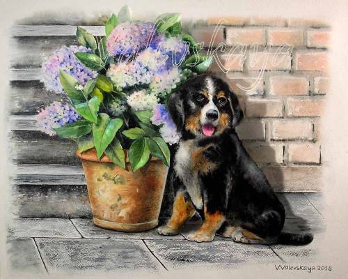 Кто бы и что бы там ни говорил, а цветы, наверное, самые прекрасные растения и лучшие друзья — так думает Бади. И хотя он пока ещё всего лишь щенок, но уже имеет своё собственное мнение, которое считает единственно верным. Ну, сами посудите: цветы ведь никогда ни на кого не кричат, не лают и не кусаются, не отбирают любимые игрушки. Да что там говорить, они даже могут долго и терпеливо выслушивать, не перебивая. Ну кто ещё на такое способен? То-то же! К тому же цветы очень красивые и приятно пахнут… конечно, не так, как вкусная сахарная косточка, но всё же. Особенно щенку нравится гортензия, которую хозяйка выставила рядом с лестницей, ведущей в дом. Цветок как раз распустился пышными шапками белого цвета, постепенно начинающими розоветь по краям. Поэтому Бади старается быть поближе, чтобы защитить ароматную красавицу. Вы спросите: от кого? Да от кого угодно! Вон их сколько вокруг бегает да летает всяких неосторожных… вот хоть бы и глупые воробьи. Они бестолково прыгают туда-сюда, суетятся, чирикают, даже бывает дерутся за какую-нибудь крошку. А ну как сломают веточку гортензии или цветок помнут, что тогда? Нет уж, лучше на всякий случай посторожить. Тем более, что и спешить щенку особо некуда. Хозяева накормили, напоили, шёрстку вычесали — что ещё нужно. Ах да, поиграть бы не забыть! Но это уж когда маленькая Вероника вернётся из детского садика. С ней весело. А пока Бади будет терпеливо охранять любимую гортензию, словно самый настоящий сторожевой пёс.