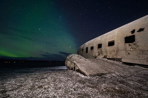 Когда-то много лет назад обычный, ни чем не примечательный самолёт вот так же скользил в голубой вышине, раскинув крылья и споря с ветром, подобно большой стальной птице. Ведь не зря же поётся: "Только в полётах живут самолёты..." Но случилось нечто непредвиденное, оборвавшее его полёт. Что послужило причиной аварийной посадки, точно никто не знает или не хотят говорить, хотя ходят разные слухи… Но, как бы там ни было, на этом далёком берегу закончил лётную жизнь старенький транспортник. И теперь сиротливо лежит обескрыленный самолёт на пустынном пляже, вспоминая бескрайнее небо и сожалея о том, что уж никогда не удастся продолжить прерванный полёт. А когда на землю опускается ночь, он с тоской глядит туда, где за дальним горизонтом блуждает по краю земли необъяснимое простыми словами сияние, окрашивая ночное небо мистическими сполохами. Там в бесконечной Вселенной мерцают крохотные жемчужинки таких манящих и недостижимых звёзд… там скрывается неведомая и волнующая тайна мироздания...
