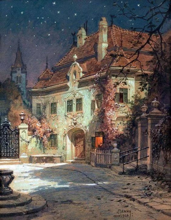 Царственная полночь медленно плывёт над старым домом яркой жемчужной россыпью по тёмному небосводу. Тихо вокруг. Даже притомившийся за день ветерок угомонился и наконец-то задремал где-то в кроне старого вяза. Пока все спят, осенняя прохлада исподволь скрадывает зелёные краски листьев, даруя взамен мягкий багрянец, постепенно выцветающий в желтизну прощального золота. Но поутру никто не обратит внимания на эту подмену — так было всегда. Лишь старый дом всё замечает, но молчит, вспоминая свою давнюю молодость, когда жизнь наполняла его от подвала до чердачных окон. Жизнерадостный детский смех звенел повсюду. По лестницам вверх-вниз бодро стучали каблучки и волнующие ароматы витали в воздухе… Ах, какое это было замечательное время! Теперь же почти все окна закрыты ставнями. Лишь одно из них — на углу второго этажа изредка приоткрывается, и тогда в глубине комнаты можно увидеть размытый женский силуэт, безмолвно наблюдающий за луной, заливающей спящую улицу молочным серебром. Да… ещё внизу бывает по ночам загорается свет в библиотеке. О том, кто его включает и зачем, знает лишь зачарованная полночь, но она не выдаст этот секрет...