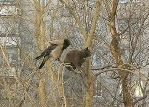 В одном из дворов нашего города (кто видел — тот знает) часто можно заметить странную парочку, восседающую на ветке дерева. Не было бы в этом ничего особенного, если бы одним из них не был кот, а другим, вернее, другой — ворона. Почему они мирно сидят рядышком, обозревая сверху двор и лишь иногда поворачивая головы друг к другу, словно обмениваясь впечатлениями? Кто они и что является залогом столь необычной дружбы? Случайные прохожие, впервые заметившие кота и ворону спокойно соседствующих на одной ветке, недоумённо пожимают плечами и идут дальше, старожилы же настолько привыкли, что не обращают внимания. А всё дело в том, что Каркушу и Черныша (так их зовут) связывает давняя дружба. Когда-то, когда Черныш был ещё котёнком, его сердобольный хозяин принёс в дом молодую ворону с перебитым крылом. Летать она не могла, но, вырвавшись из рук, принялась бегать вприпрыжку по квартире и скандалить. Хоть как ворона и не уворачивалась, всё же её поймали и выровняв крыло надёжно прибинтовали его к тельцу. Долго ещё страдалица никак не могла успокоиться и возмущённо каркала, поэтому и получила своё прозвище.