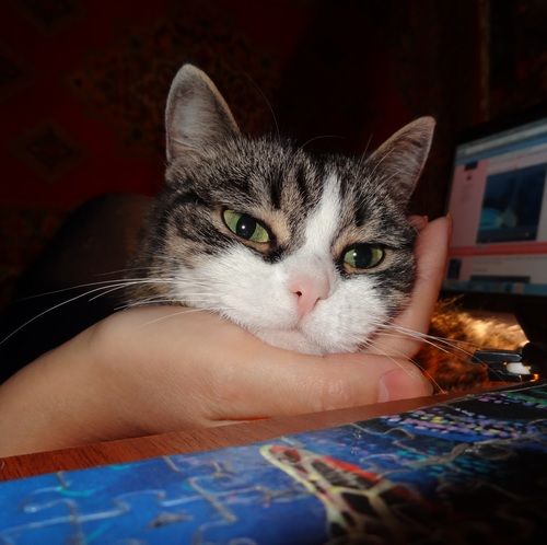 Тимка существо деликатнейшее и умнейшее и самый ласковый кот в Галактике. Никогда никакого ора; кушать просит, садясь на подлокотник кресла и заглядывая в глаза. Пристально. Без звука. Разве что если посмотреть на него и спросить: «Тимка, ну что?» ответит: «Мрр-ми!» и я сразу вспомню, что кот не кормлен.