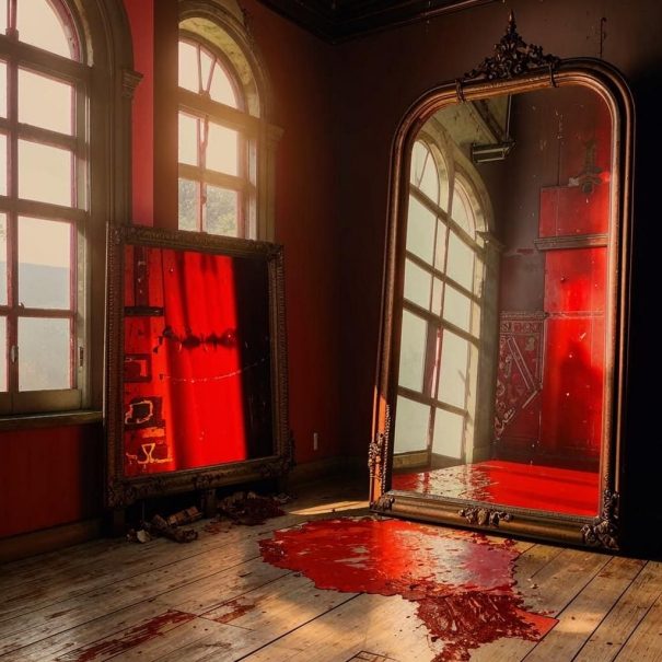 Гостиная сразу показалась Кетлин какой-то чужой. Там отсутствовала вся мебель, а посередине комнаты стояло огромное зеркало в резной раме. Но это были не все странности обновленной комнаты — около зеркала стояла банка красной краски и лежала большая кисточка.
