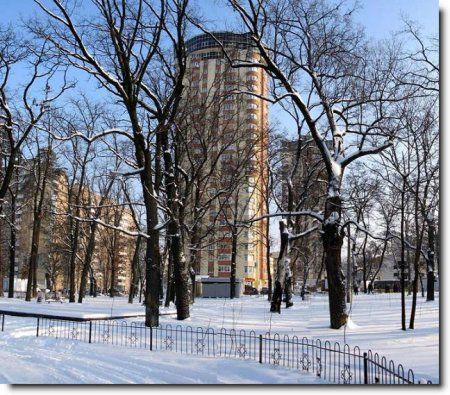 в белых шапках скаты крыш,
