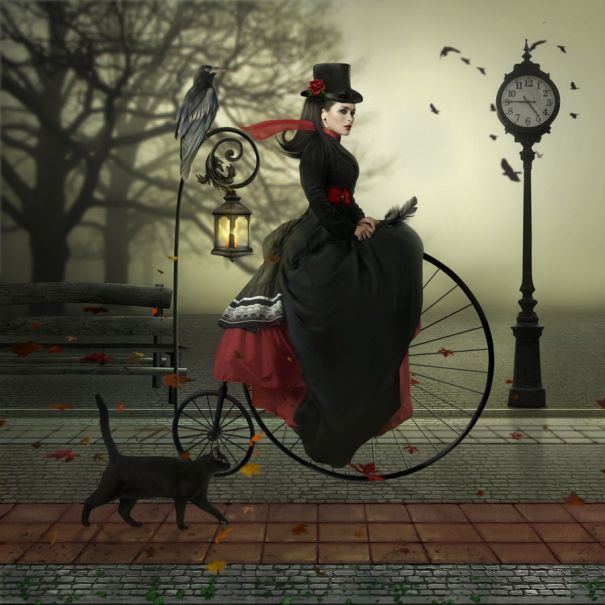 Черное — желтое. Ворон — как страж теплого пламени, солнца кусочек хранит в фонаре. Вдаль по дорожке мимо скамейки, мимо деревьев, мимо часов черная кошка мягко ступает. Листья кленовые золотом павшим под лапы стелются рваным ковром. Троица движется, не опоздают, во время будут нынешним вечером.