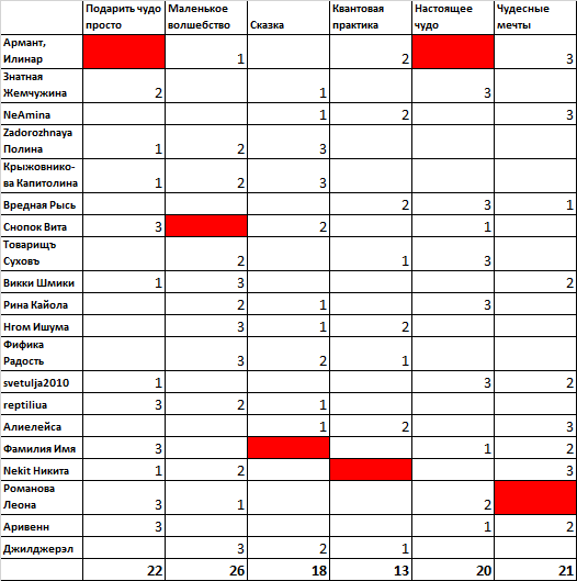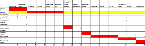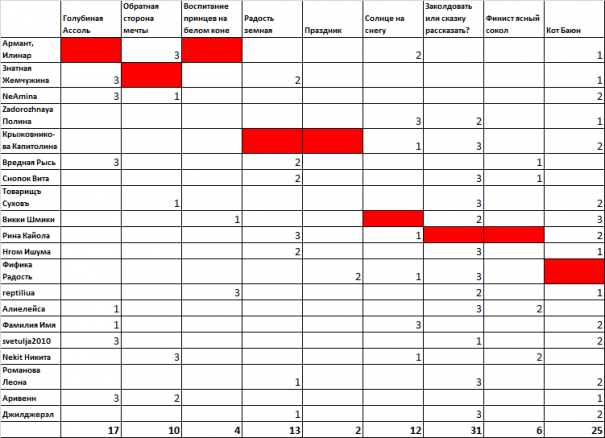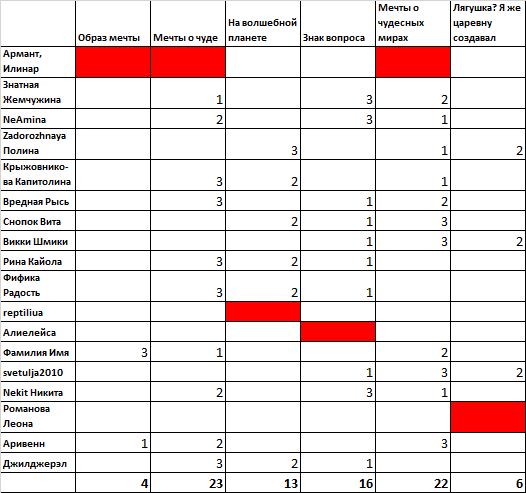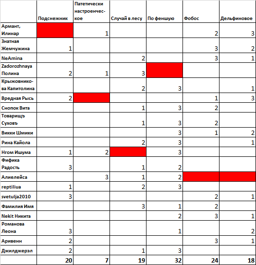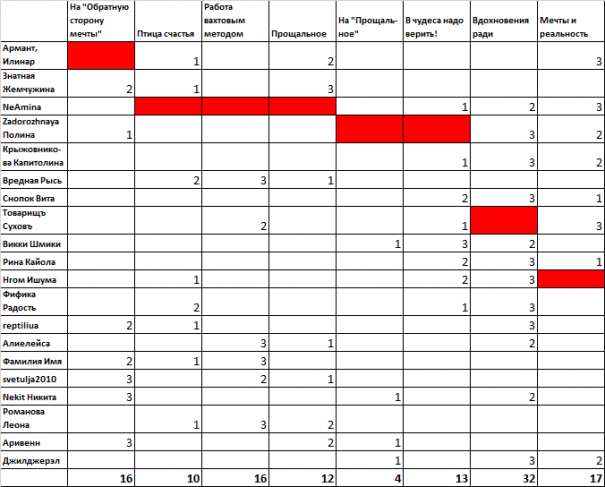 ** Поскольку произведения Полёт мечты и Храниитель мечты принадлежат перу автора Kartusha, который не проголосовал, 3 место достаётся следующему автору.