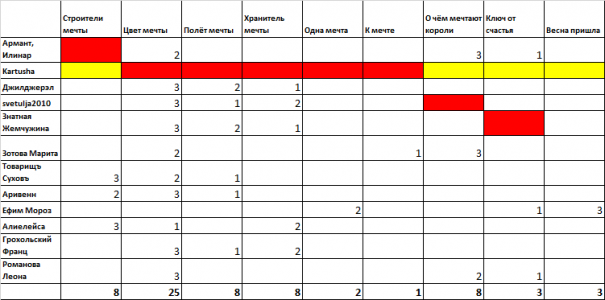 * Поскольку произведение Цвет мечты принадлежит перу автора Kartusha, который не проголосовал, 1 место достаётся следующему автору.