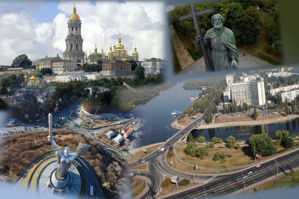 Примечание: использованы фотографии памятник Владимиру и монумент Родина-Мать, ракурс необычный — снято сверху, Печерская лавра и массив Русановка — киевская Венеция (расположен на небольшом острове).