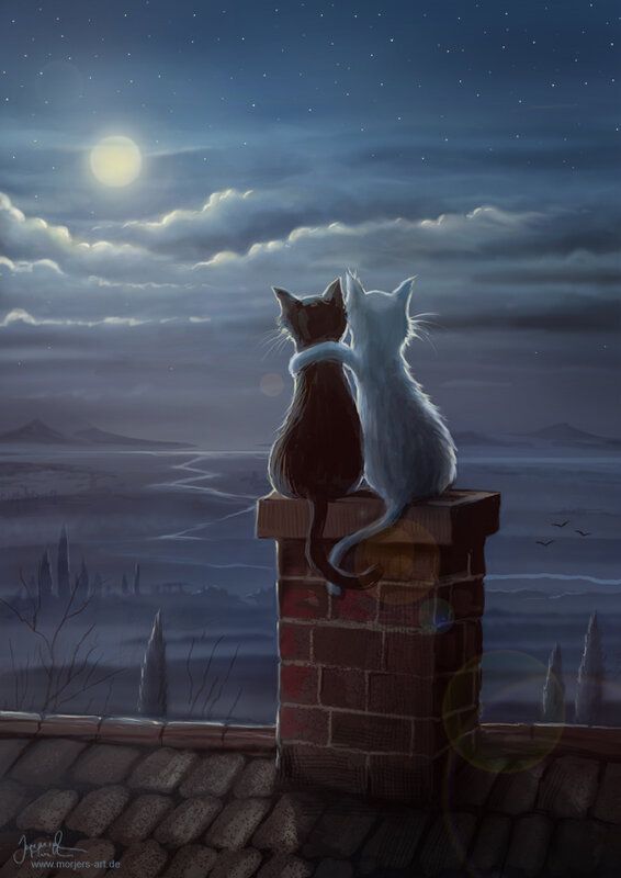 Небо окрасилось разноцветными полосами, будто градиент. День не хотел отдавать права ночи, пытаясь еще задержаться на пару мгновений. На крыше сидели два кота. Один был белоснежным, а другой — черный, как крыло ворона. День был солнечным и жарким, и крыша дома не успела остыть.