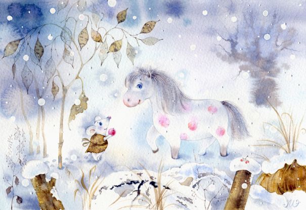 Зима трудное время для всех. И для мышек тоже. Ксюша целый день бегала в поисках хоть какой корочки, хоть самой маленькой, много ли мышке надо? Снег спрятал всё: и семечки, и огрызки, брошенные людьми — всё надо было откапывать. Ксюша копалась, копалась и накопала кучку ягод. Кто потерял эту горсточку, было не важно, главное, что она сейчас нашлась. Клюква была похожа на ярко красные льдинки, и они совершено не кусались, зубы можно было сломать. Но мышка так обрадовалась еде, что несколько раз обежала вокруг находки. Первые ягодки пришлось отогревать всем телом, иначе оторвать их от общей груды, чтобы перетащить в родной подвал, было невозможно. Ксюша дышала на ягодку, гладила её лапками, а когда та поддавалась, кусала и тянула изо всех сил. Так стараниями все и перенесла к себе в дом. Мышка разложила ягодки в углу, пересчитала богатство — хватит на целых пять дней жизни. Можно и успокоиться и даже съесть клюковку, но что-то тянуло из подвала. Ксюша подумала про себя, что верно там ещё ягодка осталась, а потому надо проверить и донести. А на улице уже стемнело, снова падал снег, и было тихо-тихо. И никого кругом. Мышка посидела у подвального окошка, поразглядывала окрестности, и решила уже, что ну её, клюковку — холодно и устала очень, как вдруг услышала тихий то ли шорох, то ли вздох. В мгновение ока Ксюша скатилась в дырку подвального окна, замерла, чутко прислушиваясь — а вдруг это кот? Но было тихо, никто в подвал не ломился, лапу в дырку не совал, пытаясь сделать ее побольше и дотянуться до хвостатой добычи. А потом опять кто-то вздохнул. Теперь мышка уже не сомневалась — это точно был вздох, протяжный и печальный. Кому-то было очень невесело. И Ксюша снова вылезла. Не могла она уйти, не узнав, кто так грустит. Фонарь хорошо освещал лестницу у подъезда, окно в подвал и кусочек заснеженной клумбы. Ничего странного не было видно: ступеньки пусты, на клумбе сугробики, прикрывающие остатки цветов. Никого. Но тут снова послышался вздох, и он доносился от снежной кочки в центре клумбы. Ксюша глядела, рассматривала сугроб, поворачивая голову то на один бок, то на другой, и наконец-то осмелилась подойти поближе. А там в сугробе запорошенная снегом по самые ушки стояла маленькая белая лошадка. Ксюша раньше никогда не видела лошадей, но вот откуда-то точно знала, что это именно лошадка, и что ей плохо — замерзает, держится из последних сил. Снежинки запутались в гриве, накрыли белой попоной спинку и бока, осели на длинных ресницах так, что глаза почти не открывались. Ксюша испугалась, что малышка сейчас упадет. «Срочно надо накормить и обогреть!» — подумала мышка и побежала за той единственной едой, что была у неё дома.