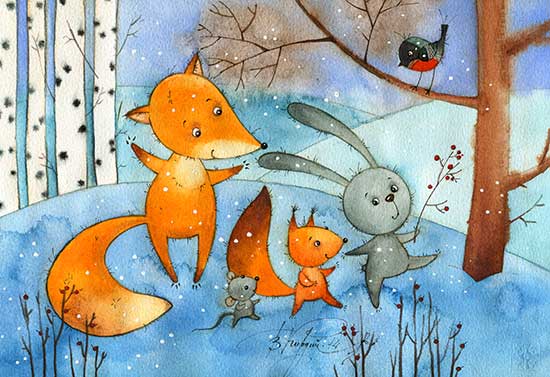 Лисица проснулась поздно утром, можно даже сказать днем, но день был такой серенький, что и не понятно — встало солнышко или только собирается. Снаружи в нору задувало холодным и каким-то сырым воздухом. Вылезать совершенно не желалось, но и спать тоже не хотелось. Лиса лежала, свернувшись калачиком, и думала про жизнь. Как-то плоховато стало жить. Скучно, серо, холодно опять же. И кушать хочется. Чтобы отвлечься от мыслей о еде, она решила заняться туалетом, почистить шубку. Но осмотр меха не радовал, пышная рыжая шерсть — краса и гордость, вылезала клочьями. «Этак я скоро в пугало превращусь» — запечалилась лиса: « Вон от хвоста какая-то серая палка осталась. Стыдоба. А все от чего? От недоедания. Эх, витаминов не хватает!» Так поговорив сама с собою и горестно повздыхав, она для приличия еще пару раз пригладила языком изрядно поредевший хвост и хотела было уже снова поспать, как вдруг услышала какой-то шум. Странный и непонятный. Ухо четко различало заячий топоток, более тихий шелест веток и шуршание сыплющегося снега — то белка скакала, и совсем тихий звук, почти неслышный от взмахов крыльев какой-то птицы. Эта тройка двигалась, причем явно вместе и целенаправленно, переговариваясь и не таясь, как обычно. «Хм, и куда это они направляются? И зачем? Интересненько!» — подумала лиса и вылезла из норы. «Может, и пообедаю сегодня,» — мысли о еде никак не хотели исчезать. Она постояла немножко, склонив голову, послушала удаляющийся звук бегущей компании и, не торопясь, двинулась за ними.