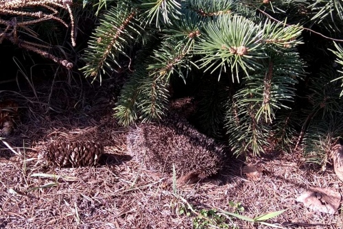 И я его увидала. А вот что бы его рассмотреть, мне пришлось преодолеть небольшую преграду в виде невысоких кустиков самшита, при этом ветки зашуршали, ёжик насторожился, все его иголочки пришли в движение, но он не свернулся в клубочек, просто привел себя в готовность ко всяким неожиданостям. И вот теперь на фото и зелёные иголочки, шишка, травка сухая и зелёненькая — и ёжик.
