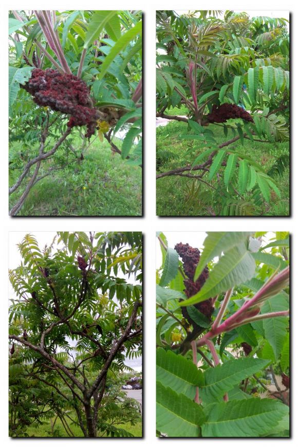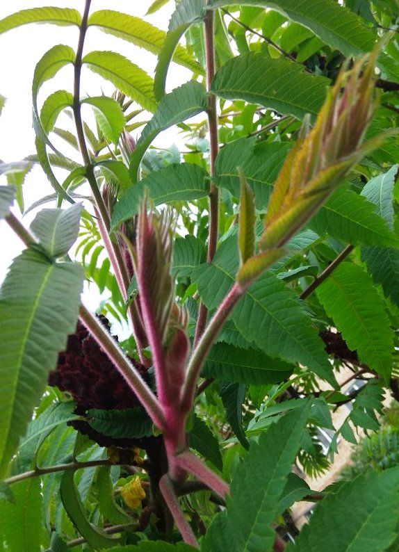 На ветках сумаха сейчас в мае вместе с молодыми побегами мы видим прошлогодние соплодия. Это такие опушенные пирамидки бордового цвета. Сами плоды могут использоваться и используются на востоке. Из плодов получают прянность, которая используется как приправа к мясу. Но вот на наших улицах я бы не советовала собирать плоды, все же выхлопные газы присутствуют в большом количестве и тяжелые металлы всегда будут содержаться в плодах.