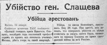 В этот день троцкист некий Лазарь Коленберг разрядил свой револьвер в Слащёва. Мотив убийства — месть за расстрелянного по приказу генерала брата.
