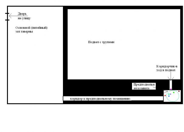 С учетом усложнения сюжетной составляющей выкладываю примерный план таверны ) Залитые черным цветом зоны — это стенки Фиолетовый квадратик — Ричард, коричневый — Антонио, красный — трактирщик, зеленый — Мария. Остальные три квадратика — это рыцарь, монахиня и служанка (требуется уточнить кто из них троих развернут к выходу сейчас — из текста я этого не понял ))