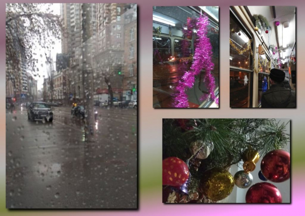 дождь, скромное и милое украшение трамвая и елка-сосна дома
