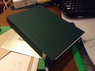 Но вместе с первой сшитой книгой я чуть изменил и обложку. Впервые сделал ее не из бумаги, а из ткани. На самом деле, это, конечно, переплетный материал — я себе уже нашел магазин, где можно достать все, что душе угодно — но все же ткань есть ткань. Результат привел меня в восторг. Ужасно капризная при подготовке, ткань куда послушнее ведет себя при работе. Сама обтекает картон, сама ложится на трафарет для тиснения — мне остается только подчеркнуть линии. И, самое главное, спокойно сгибается-разгибается. Плотная бумага вот лишних сгибов не любит, и на корешке, если часто читать, это становится заметно.