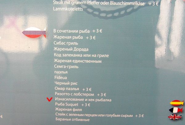 Гуляем. Проходим мимо ресторана. Видим меню на всех языках. И русский флажок тоже есть.