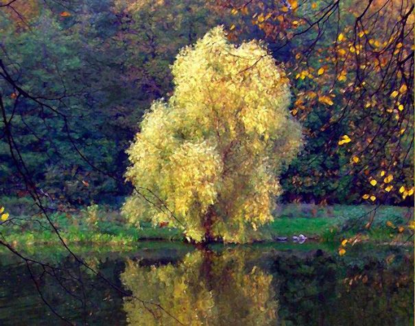 А началось давно, ещё в москве. Мы тогда только учились. поехали на Крымский вал. И там всегда был вернисаж. И я увидел молодых художников реалистов. И картины были, как раз, как фотографии.) И я заразился. Даже свои методы стал придумывать. Например, те же листья рисовать. Брал жёсткую кисть, прореживал её, потом окунал в краски и делал сразу много точек. какие-то светлее, какие темнее. А потом уже тонкой кистью размазывал. И получалось сразу много листиков. вот, к примеру, осень. У меня свой стиль выработался! Называется — «фотография плохим фотоаппаратом» вроде бы, реализма хватает, но… наляпано всё равно.)