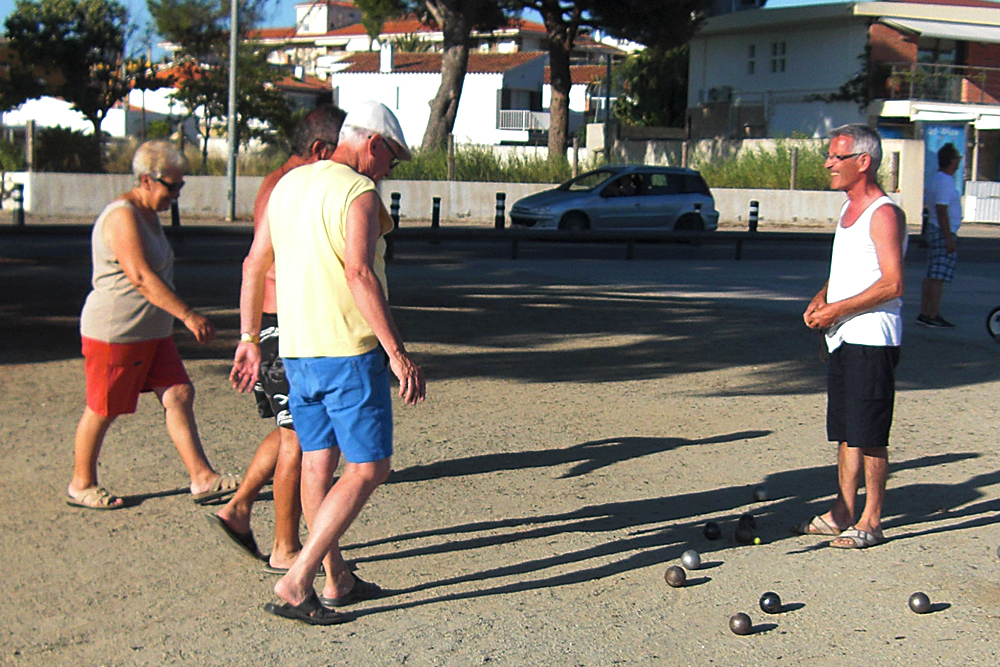 В общем, это две команды. Они шары бросают. А ещё там есть деревянный шар — кошонет. И кто ближе свой шар к этому шару бросит… у нас как-то не особо познания в этом деле.) В этот петанк пенсионеры, в основном, играют. А в правила мы и не влезали.)