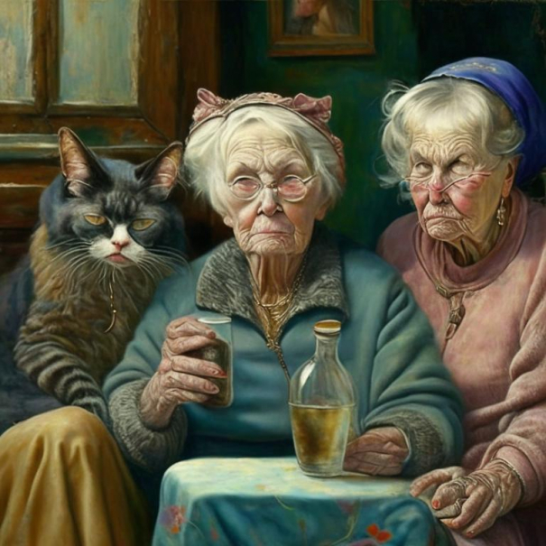 вот недавно были Эскизы, с портретами. И мы задали задание — бабушка, мама и внучка сидят за столом, рядом сидит кот, уют…