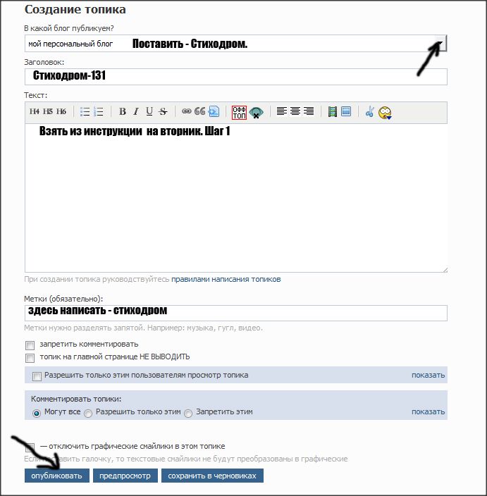 Стрелочка там тоже есть, где делать стиходромы. А не персональные блоги. Правда, забыли написать, что в него нужно сначала вступить.