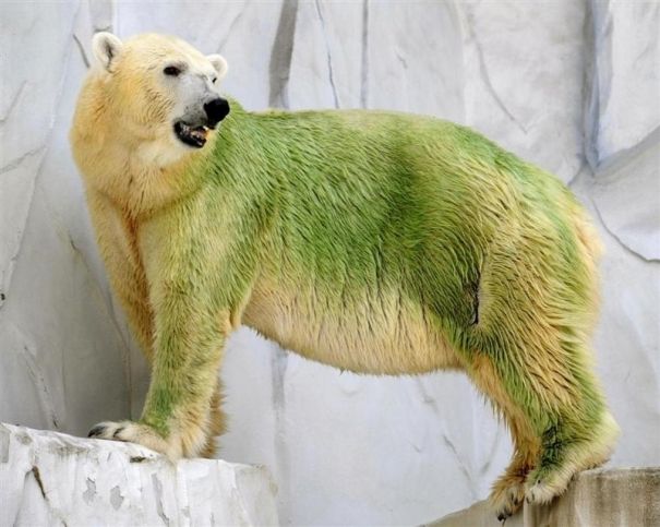 Шерстинки меха белого медведя — полые внутри и заполнены воздухом для большей теплоизоляции. Проживающие в условиях крайнего севера животные не замерзают даже при самых низких температурах благодаря своему меху. Но в непривычном для медведей теплом влажном климате внутри волосков могут поселиться водоросли, попавшие из воды, которую животным в зоопарке наливают для купания.