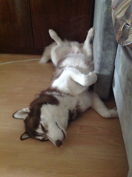 Спим только в таком положении. Других положений нет. Предполагаю, что через живот, мало прикрытый шерстью, регулируется теплообмен.