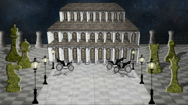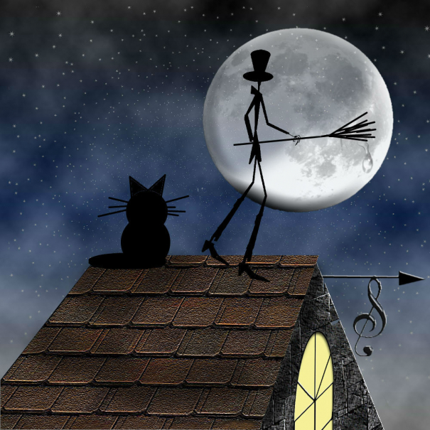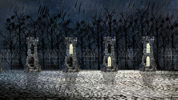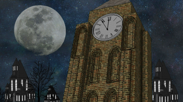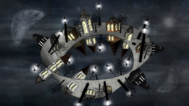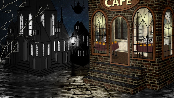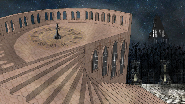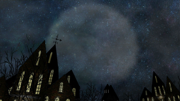 Часы на ратуше бьют полночь. Теперь становится видно, кто следит за героем: это череп с перепончатыми крыльями. Взгляды героя и демона встречаются. Герой пугается, хочет бежать, но взгляд демона завораживает, герой останавливается, смотрит. Здесь нужно показать, что демон не гипнотизирует человека, не подавляет его волю – просто сам человек начинает понимать, что демон не причинит ему вреда, и с интересом разглядывает демона.