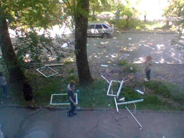 Только что взорвался соседний дом. Картина бедствия прилагается. Предположительно, виной всему бытовой газ. Сейчас появилась информация — взорвался газовый баллон. У нас выбило стекла на балконе. Кот от страха улетел из комнаты в кухню и в который раз повалил телевизор, оборвал антенны.