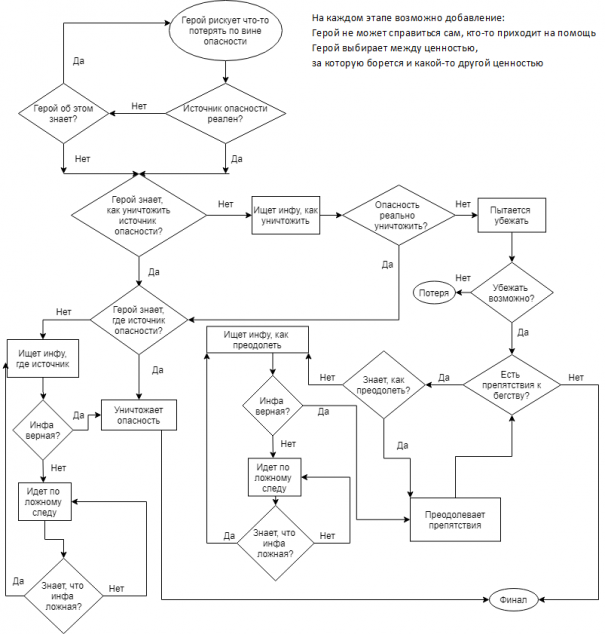 А действия героя — у меня есть алгоритм действий героя. Пока у меня программа пишет по этому алгоритму. Но в перспективе буду учить прогонять сюжеты книг через алгоритм: тут герой хочет что-то добыть, тут убегает от опасности…