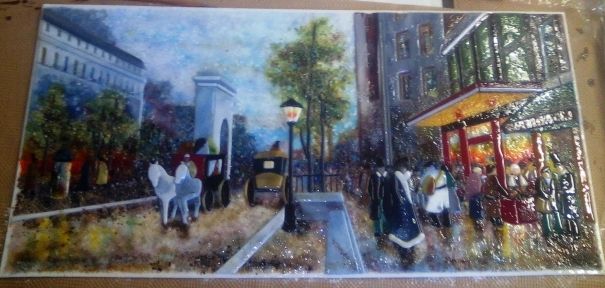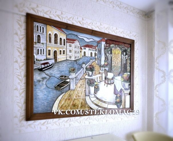 Роспись лаками, она запекаться не будет. Печь у нас метр на полметра. Панно — 850 на 430, вроде. Стоит такая радость 30 т.р.