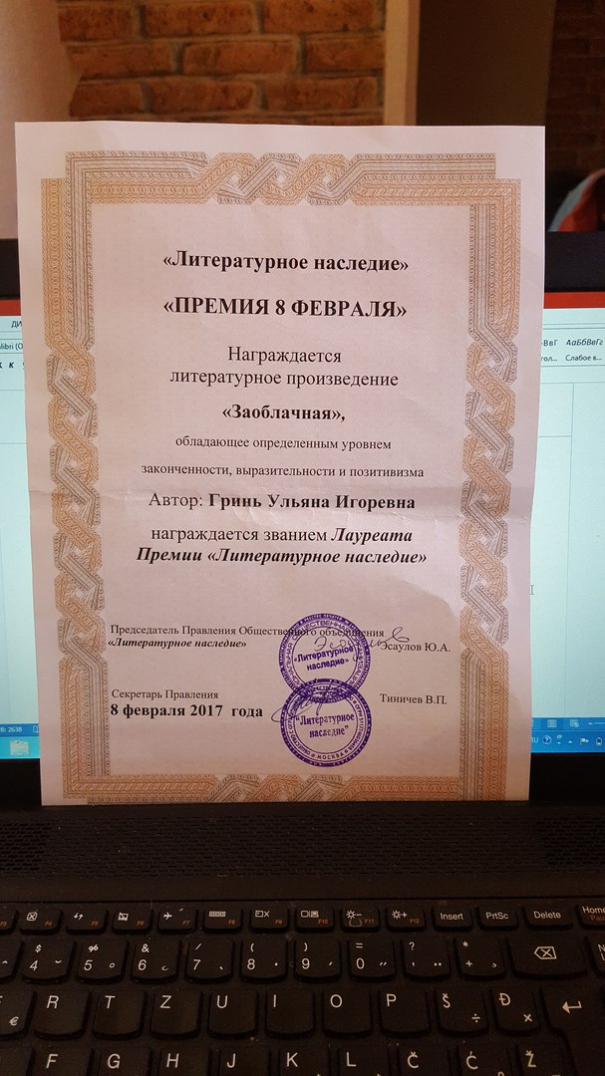 Улечка получила диплом лауреата премии Литературное наследство. Для тех, кто не в курсе, отчество мое там ууказано, теперь без отчества отзываться не буду ))))