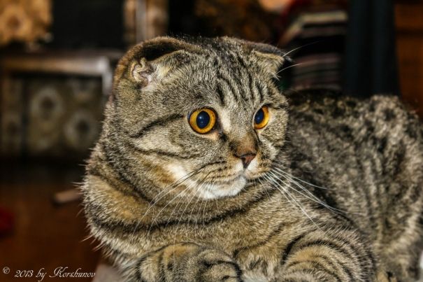 Не знаю. Обычные кошки тоже так выглядят, когда напуганы. Да и голова из-за таких ушей круглее кажется. Такое впечатление, что они все время немного настороженны.