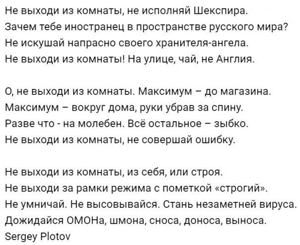 Вечером 26 мая в Москве на Арбате был схвачен полицаями и доставлен в местное отделение десятилетний ребенок, который вслух громко декламировал отрывки из «Гамлет»а Вильяма нашего Шекспира. Инет облетели кадры видео, где перепуганного и отчаянно вопящего ребенка пытается защитить Мать. (Хоть и не родная — мачеха — но настоящая мать с большой буквы). Она не испугалась упырей в погонах и дралась до последнего, оберегая своего пасынка, вся вина которого (повторяю) заключалась в чтении стихов. В дальнейшем средства массовой пропаганды без всякого сомнения обвинили мальчика в попрошайничестве, мачеху в сопротивлении «законным» действиям правоохренителей, а отца — в плохом воспитании сына (того самого, который «Гамлета» наизусть знает). В нашем сказочном государстве всегда виноватыми оказываются жертвы произвола, а не одуревшие от безнаказанности бандиты, ряженные в мундиры.