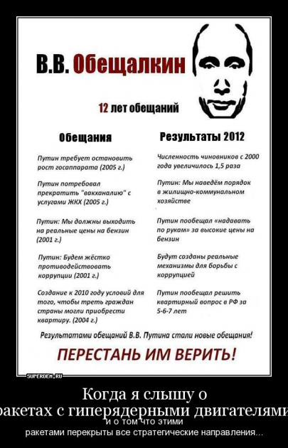 Вы меня не знаете, ни разу не видели, а уже даёте определения, кидаетесь грязью. Я поначалу пытался не переходить на личность, желая разговора по сути, но вам желательны срач и оскорбления. Желая дискредитировать собеседника, вы не сможете тем самым обесценить его высказывания. Они же из объективной реальности, данной нам в ощущениях. Сколько бы вы не прятали голову в песок от истины, торговые центры будут гореть, самолёты будут рушится, метро будет взрываться, дети будут травиться в детских садах, педофилы продолжат насиловать мальчиков в интернатах и виноват в этом будет конечно Ельцин, Обама, Тереза Мей и Навальный, но не гарант стабильности.