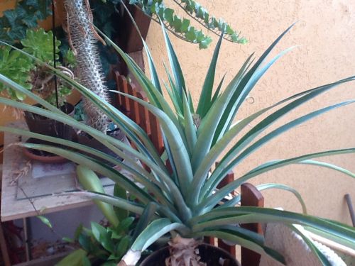 Это ананас вид с шагового расстояния. Та пимпочка на самом верху — и есть вожделенный плод. Пока он около 6 см в диаметре