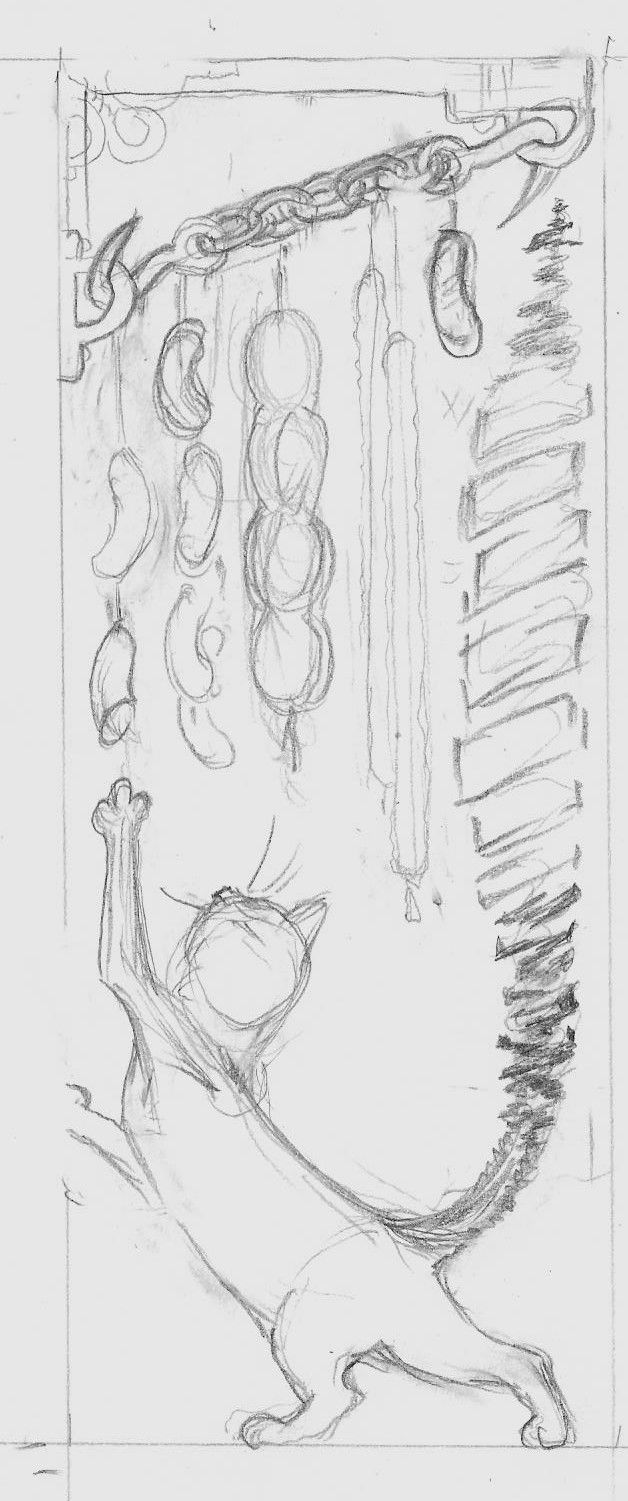 котэ — это фигня. Меня с точки зрения композиции и организации пространства наличие 9 сосисок травмирует — будт бить мелким горохом рисунок. До сосиски его дотяну, Но колбасы выполняют функцию подпоры хвоста + концентрации взгляда на лапе и сосиске. Если там сделать бамбуковый сосискин занавес, то это будет горох))