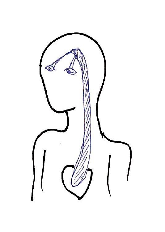 мне кажется я «вышла» не через лоб, а где-то в области сердца… Но это вот точно не помню, но у меня всю жизнь ощущение, что тело — оно просто одежда, а я где то внутри, в виде такой улиточкию. щаз нарисую…