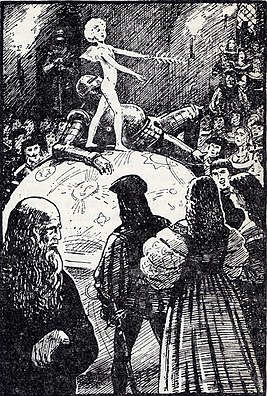 Рисунок из «Детской энциклопедии» — была у меня в детстве. «Золотой мальчик». Малыша покрасили золотой краской для представления аллегории «Рождение Золотого века», но бедняга почему-то умер. О причине смерти спорят до сих пор — то ли токсин в краске, то ли переохлаждение. На переднем плане в картинке — Леонардо да Винчи. Видимо, он и раскрашивал мальца.