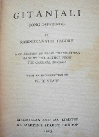 Будучи в Лондоне, он показал несколько самостоятельно переведенных на английский язык стихов из «Гитанджали» своему другу, британскому художнику Уильяму Ротенштейну, на которого те произвели большое впечатление. При содействии Ротенштейна, Эзры Паунда, Уильяма Йитса и других лондонское «Индийское общество» (India Society of London) издало 103 переведенных стиха Тагора — в 1913 году, а ещё через год появилось четыре русскоязычных издания.