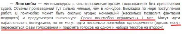 И где здесь упоминание, что набор текстов может проходить одновременно? И где здесь норма, что лонгмоб может «по просьбе трудящихся» продлеваться более месяца? Опять что-то в Правилах не так? Или у Вас свои какие-то «правила», отличающиеся от Правил МП? «Просили, значит просили»? И что? А я попрошу придерживаться ПРАВИЛ, каков будет ответ от АДМИНА ИГРЫ (Вы же так себя рекомендуете, вроде бы?) Надоел этот беспредел.