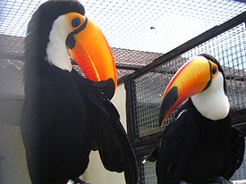 Такой характерный клюв только у них. Причём и порода этой птички видна по окрасу — тукан большой. Есть ещё и тукан белогрудый, но у того клюв не жёлтый.