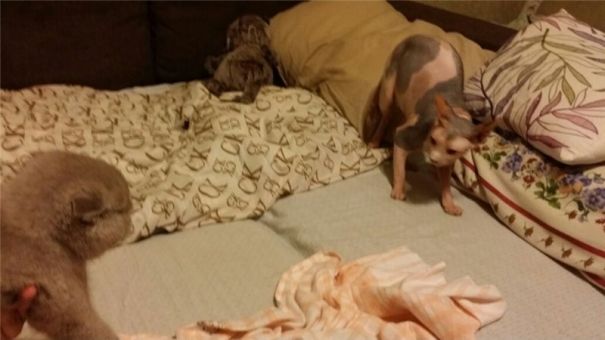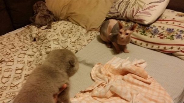 Тут казус сегодня вышел. Привез Еву к дочке. Ее вислоухая британка Фани не потерпела вторжения на свою территорию сфинкса Евы. Вот что деффчонки не поделили? Шипят друг на друга, царапаются и кусаются. Бедная пикинесиха Мотя. Она в шоке! В недоумении! Облизывает одну, потом другую. Но мира походу не будет. И чего не поделили?