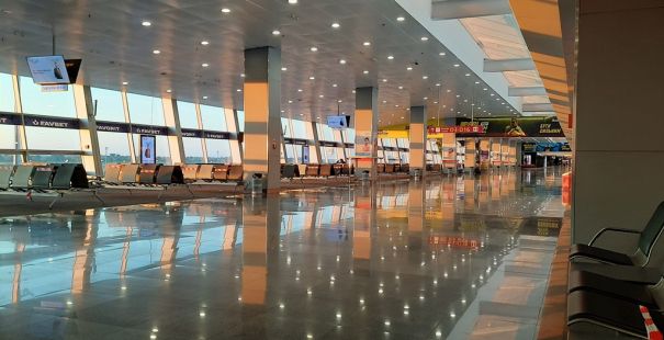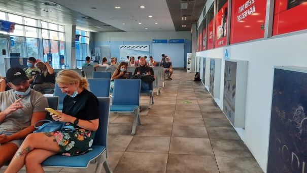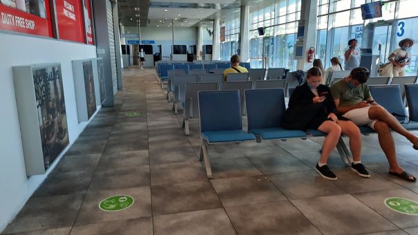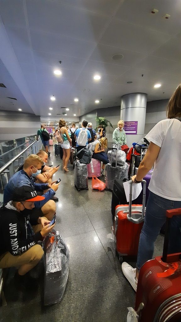 Сам по себе аэропорт очень маленький и ни о какой социальной дистанции не может быть речи. Наш рейс был единственным в это время, но людей от стенки до стенки насобралось так, что и яблоку негде было упасть. Хоть периодически и предупреждали, что надо соблюдать дистанцию, физически это сделать было сложно. Зал ожидания тоже мал. Все кресла моментально заняли. То есть мест в зале всего на один самолет. Дьюти фри закрыт. Хоть наш гид и говорила, что он должен быть открытым, в итоге не то что каких гостинцев домой прикупить, даже элементарное – воды негде было взять. Хоть с крана пей. Получается нам можно было в зал ожидания проносить воду, хотя обычно заставляют выбрасывать. Но никто об этом не предупредил.