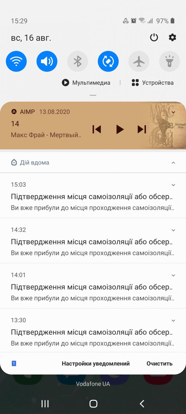 В итоге приложение каждые полчаса мне напоминало, чтоб надо бы нажать кнопочку и подтвердить локацию. Благо ночью оно не квакает. И кстати звук есть, хотя где-то писалось, что у оповещений нет звукового сопровождения и что надо самому проверять, не пришло ли тебе там чего. Еще писалось, что подтверждения оно запрашивает с 9 утра до 9 вечера. Ночью дает спать. Но подружке последний раз приходило в 9:20 вечера.