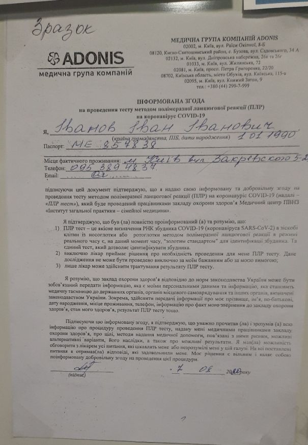Нашли ее, а там толпа. Два с половиной часа простояли в очереди. На весь поток людей всего два человека в окошке регистрации. Бланки мы заполняли на коленке, как считали нужным. Образцы, конечно, были — на стенке, только за толпой не видно. Уже когда к окошку регистрации подходишь, замечаешь. Ну и куча пустых бланков четырех разных лабораторий на небольших столиках. Не знаю, были ли там ручки.
