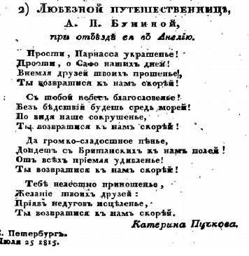 Любезной путешественнице А. П. Буниной, при отъезде ее в Англию.