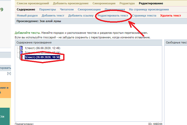 Чтобы отредактировать сам текст, нужно выделить главу и нажать «редактировать текст»