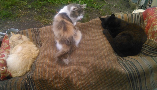А это летом мы на старую лестницу накинули ковер ненужный, и получилось внизу укрытие, а наверху — лежанка на солнышке. Рыженький кот — самый старенький, черный — прибился и мы его и оставили, а малявочку еще крошкой с улицы забрали